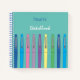 Un libro de bocetos verde azulado para los niños con el doodle de las plumas de parentesco de colores. Personalízalo con el nombre del niño. Este diseño también está disponible en naranja claro y negro. © ArianeC Ilustraciones-Todos los derechos reservados