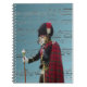 El collage digital divertido de un animal divertido del perro vestido como comandante de tubo escocés que llevaba una falda escocesa escocesa roja tradicional del vintage del tartán fotografió en los juegos de una montaña en Escocia en un fondo azul con las notas musicales de la cuenta de la música. Visite la TIENDA de IMPRESIONES del VINTAGE para los animales excéntricos del personaje de dibujos animados de la diversión a juego.