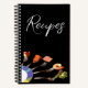 Este cuaderno de recetas dura de estilo moderno presenta comidas en tenedores con un fondo negro que contrasta. "Recetas" está escrito en script, aunque puede personalizarlo con su propio texto y elegir otro tipo de letra. El diseño es una plantilla, por lo que si prefiere otra foto, utilice el editor para eliminar la foto existente y, a continuación, agregue la propia. Un cuaderno de recetas sería un regalo meditado para él o ella.
