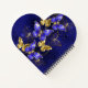 Composición de lujosas mariposas de zafiro y joyas de oro sobre fondo de textura azul.