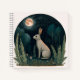 Un conejo feliz se sienta a la luz de la luna con flores y otras plantas con árboles altos en el fondo.