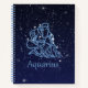 Un cuaderno en espiral con el símbolo de Aquarius en azul plateado suave, cubierto con las estrellas de la constelación, contra un fondo estrellado del cielo clasificado de azul oscuro a negro.