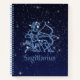 Portátil espiral con el símbolo de Sagittarius en azul plateado suave, cubierto con las estrellas de la constelación, contra un fondo de cielo estrellado clasificado de azul oscuro a negro.