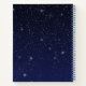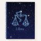Cuaderno espiral que ofrece el símbolo para el libra en azul de plata suave, sobrepuesto con las estrellas de la constelación, contra un fondo estrellado del cielo calificado de azul de medianoche profundo para ennegrecerse.