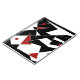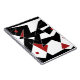 Varias formas geométricas de color blanco y rojo se reparten en un fondo negro, creando un contraste marcado. Algunas formas están interconectadas con líneas blancas finas y los puntos rojos agregan un toque de color a la composición.