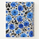 Un patrón de flores azules con hojas negras sobre un fondo blanco, creando un diseño gráfico y moderno.