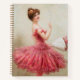 Ballerina en un tutu rosado caliente sosteniendo un cuaderno sobre un ramo de rosas