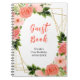 This fun and whimsical birthday party guest book features watercolor coral pink red roses and foliage on a gold geometric frame. The text combines handwritten script and serif fonts for a stylish and modern look. This is perfect for a spring or summer rustic birthday party.