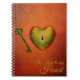 Ilustracion romántico y encantador con un corazón dorado y una llave sobre un fondo rojo estructurado. Cita de amor de Gold Script: "La llave de mi corazón".