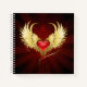 Corazón rojo brillante de un ángel con alas doradas brillando en el fondo rojo oscuro y radiante decorado con un patrón.