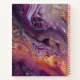 This notebook features a swirling marbled fluid art print in deep purples, gold and orange with cellular lace textures - evokes cosmic nebulae, molten metal and organic, vein-like patterns.