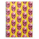 Cuto cuaderno de patrón de cráneo con un ilustracion personalizado de un divertido cráneo rosa con pómulos color rosa y dos fantasmas bonitos en sus jócalos mirando unos a otros y una pequeña araña adorable sonriente sobre uno de estos amigos miedosos. Este divertido diseño macabro tiene colores psicodélicos brillantes, trippy, rosa y amarillo.
