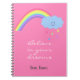 Este lindo cuaderno tiene las inspiradoras palabras "Creer en tus sueños" en escritura blanca bajo un arcoiris que está parado en una nube sonriente. El fondo es de color rosa chocante. El bloc de notas se puede personalizar con cualquier nombre.