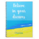 Una hermosa playa con arena dorada y cielo azul en la parte delantera de un cuaderno, con el guión motivacional "Creer en tus sueños" para usar en el trabajo, escuela o universidad. ¡Inspira! Se puede personalizar con un nombre.