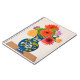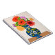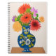 Una vida digital semi-abstracta de naranja de coral y crisantemo amarillo mostaza en un florero chino azul oscuro, de estilo antiguo