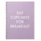 El bonito dicho, COME CUPCAKES PARA EL DESAYUNO sobre un fondo lila, acentúa este cuaderno, haciéndolo perfecto como un regalo.