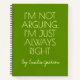 Add some humor to your legal life with this “I’M NOT ARGUING, I’M JUST ALWAYS RIGHT” personalized notebook! Perfect for jotting down case notes, study reminders, or daily affirmations of brilliance. Ideal as a law school graduation gift, attorney appreciation gift, or funny office present for coworkers in the legal field. Customize with a name for a sleek, smart, and sassy keepsake — because lawyers don’t argue, they win.
