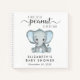 Un libro de invitados para la ducha de un bebé con "A Sweet Little Peanut Is On His Way" escrito en una mezcla de tipografía gris suave y un guión elegante, y una acuarela azul pastel de un elefante bebé. Personalice el nombre de la futura madre y la fecha de la ducha en una simple tipografía gris.