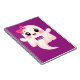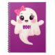 Imagine a charming little ghost, complete with a sweet pink bow and sparkling purple eyes, gently saying "Boo!" in a playful, friendly manner. It’s hard not to smile at such an endearing spirit!