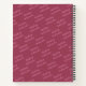 The spiral notebook design has the "Refreshing Watermelon" diagonal pattern on a pink-redish background on both the front and back. The artist's watermelon chibi character is located at the bottom right of the front cover, which also features a white box with red borders with the owner's name and journal writing inside. The dashes give the box a notebook appearance.