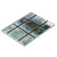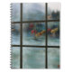 Un frío paisaje otoñal visto a través de una ventana de escarcha temprano una mañana. Pinos y pinos con hielo blanqueando sus agujas, armazones en tonos rojos, naranjas y amarillos, de hierba blanquecina helada vista a través de la niebla, saliendo de un arroyo oculto. Las hojas de rosa rojas y verdes que ondean la ventana a cada lado.
