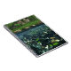 Escena submarina dividida con un valle verde por encima y las profundidades frías de un río montañoso rocoso por debajo. Los rayos solares bailan a través del agua y los bancos de peces plateados nadan entre las piedras y las malezas del lecho del río.