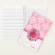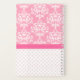 bloc de notas en espiral de bonito con un patrón de damasco rosa y blanco en los dos tercios superiores de la cubierta, y un patrón de puntos de polka rosa y blanco, en la parte inferior. La gráfica de una cinta rosada se extiende a través, entre los dos fondos y está decorada con una fotografía realzada con gráficos de una margarita de Gerber rosa. Personaliza el texto, para ti mismo o como una gran idea de regalo.