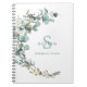Cuaderno de planes de boda con monograma botánico de eucalipto y brillo dorado... Nuestro cuaderno de ideas de boda botánicas para novias presenta un arreglo de hermosas hojas de eucalipto pintadas con acuarela y follaje dorado que enmarcan el nombre de la novia, la inicial del monograma y el título del cuaderno. Un regalo de despedida de soltera considerado.