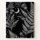 Diseño botánico celestial que presenta hojas de helecho detalladas, flores silvestres y una luna creciente sobre un fondo oscuro nocturno. Esta ilustración mística de la naturaleza combina la estética botánica, celestial y cottagecore, creando un aspecto mágico inspirado en el bosque.