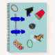Un cuaderno increíble que presenta patines de cuatro ruedas, patines en línea, una bebida con hielo picado, pulseras de gelatina, futbolín, una bola de discoteca, nachos, y una pista de patinaje con manchas de luz y una astilla en la superficie.