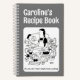 El gracioso Chiste Personalizado muestra a una cocinera que trabaja duro en la cocina mientras su esposo o pareja se relaja en el sofá. Libro de recetas de portada personalizado. Fondo gris.