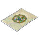 Arcos de estilo Art Nouveau rodean las capas de vidrio manchadas de esta mandala, con fuegos artificiales, girasoles, conchas, soles y tormentas en colores vivos que encarnan la actividad que viene con el verano.