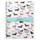 Cuaderno lindo que para requisitos particulares usted puede modificar con su nombre. Ofrece pequeños perros coloridos del dachshund en un fondo blanco. Una raya de la aguamarina corre a través del centro que espera su nombre.