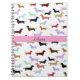 Cuaderno lindo que para requisitos particulares usted puede modificar con su nombre. Ofrece pequeños perros coloridos del dachshund en un fondo blanco. Una raya rosada corre a través del centro que espera su nombre.