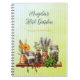 Cuaderno de jardín de hierbas encuadernado en espiral. El diseño es un estante de frascos que contienen hierbas, bayas y flores. Personalice el divertido texto en escritura en la parte superior. El fondo está compuesto por rayas verticales azules claras y verdes. Un borde de volutas separa el texto de los frascos de hierbas. Las páginas rayadas pueden contener información sobre siembra, crecimiento y cosecha, junto con remedios y tés herbales caseros.