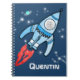 Personalice esta explosión fuera del espacio de los niños cohete portátil azul / diario con su propia elección de nombre y foto en el orificio del puerto, actualmente lee Quentin. Ilustracion original y diseño de Sarah Trett.