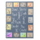 Este divertido cuaderno de espiral le inspirará a dibujar, pintar, dibujar y hacer garabatos. Las palabras inspiradoras de una fuente divertida incluyen Crear e Imaginar. Otras palabras se refieren a las herramientas que usan los artistas, como tinta, lápiz, carbón vegetal y pastel. Estudios antiguos de manos, pies, ojos y oídos bordean la cubierta por todo el camino.