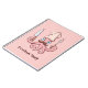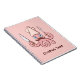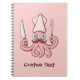 Dibujo animado de chef calamar rosa con bigote sosteniendo cuchillo y tenedor de cocina. Color de fondo personalizado. Texto personalizado.