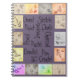 Un cuaderno en espiral para el artista en tu vida. Los dibujos antiguos bordean el cuaderno como azulejos. En el centro hay palabras como dibujar, dibujar, dibujar, pintar, garabatear, imaginar, crear, crear, tinta, carbón vegetal, lápiz y pastel en una fuente divertida.