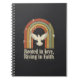 Un colorido arco iris retro y un diseño de fe de paloma que muestra el mensaje 'Enraizado en la fe, alzándose en el amor'