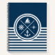 Diseño de temática náutica con símbolos náuticos (ancla, velero, velero, brújula) sobre fondo rayado blanco y azul marino.