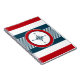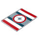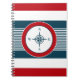 Diseño náutico con decoración de brújula en forma redonda sobre fondo rayado azul, rojo y blanco