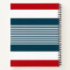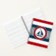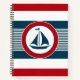 Diseño náutico con decoración de velero en forma redonda sobre fondo rayado azul, rojo y blanco