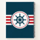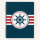 Diseño náutico con decoración de ruedas de vela en forma redondeada con estrellas sobre fondo rayado rojo, azul y blanco