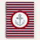Diseño náutico con decoración de ancla dibujada a mano sobre fondo rayado azul, rojo y blanco