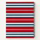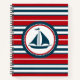 Diseño náutico con decoración de velero en forma redonda sobre fondo rayado rojo, azul y blanco