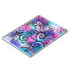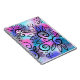 Un pájaro divertido, bonitos elementos florales y un pequeño corazón sobre un fondo rosa, violeta y turquesa.