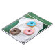 Este cuaderno presenta tres donas glaseadas, azul, rosa y chocolate. Envíame un mensaje si necesitas ayuda o tienes alguna solicitud especial.