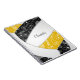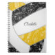 This pretty volleyball themed notebook features the realistic image of an abstractly oversized volleyball that has black, gold and white panels with delicate hand-drawn doodle flowers, feathers and paislies in white patterned on the volleyball's black and gold panels - customize with the athlete's name - by katz_d_zynes