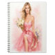 A beautiful woman in a flowing pink dress holds a bouquet of flowers and a pair of high heels in this elegant watercolor illustration.